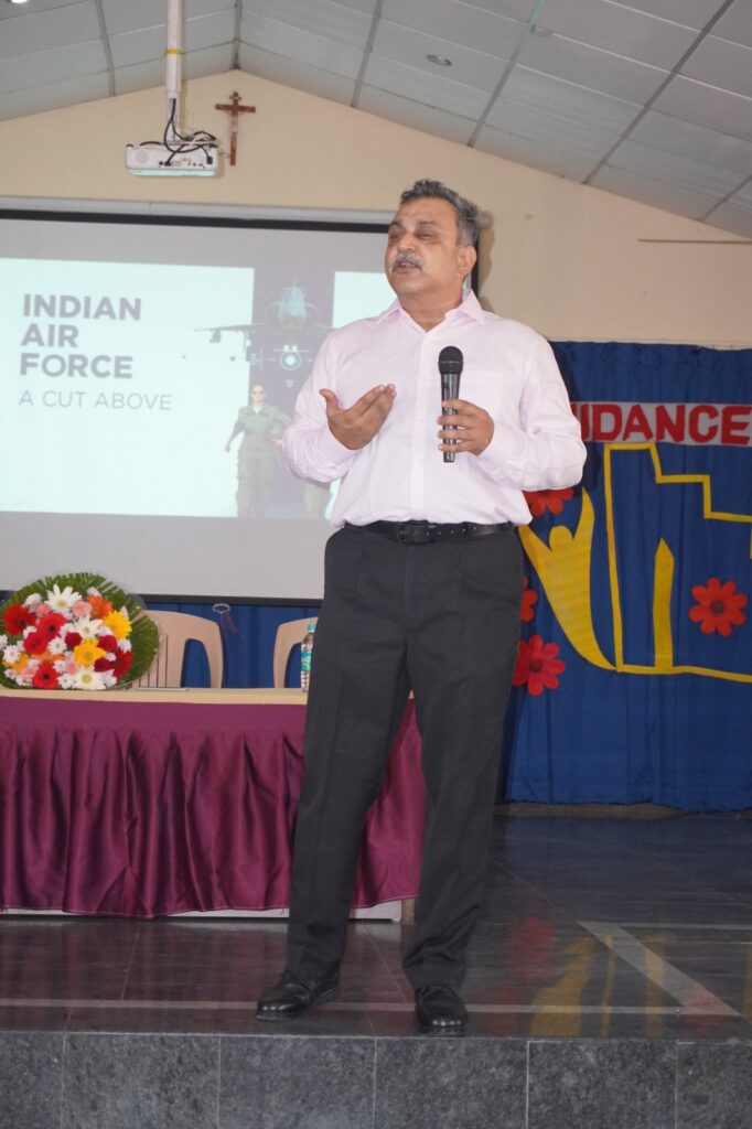 Motivational Talk by Air Force Officer on NDA and Career Opportunities A special motivational session was conducted for our Class 10 students by an esteemed officer from the retired Indian Air Force Group Captain, Karthik. The officer delivered an inspiring talk on the importance of discipline, dedication, and determination in achieving one’s goals. He enlightened the students about the National Defence Academy (NDA) and other prestigious career opportunities in the armed forces, emphasizing the values of patriotism, leadership, and service to the nation. The session provided valuable insights into the selection process, eligibility, and preparation strategies for the NDA and other competitive exams. Students were encouraged to dream big and work hard, with the officer sharing personal experiences and success stories that left a lasting impact. It was a truly enriching and motivational experience that instilled a sense of purpose and pride in the hearts of our young learners.